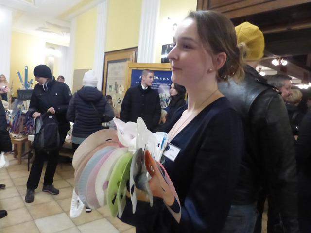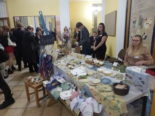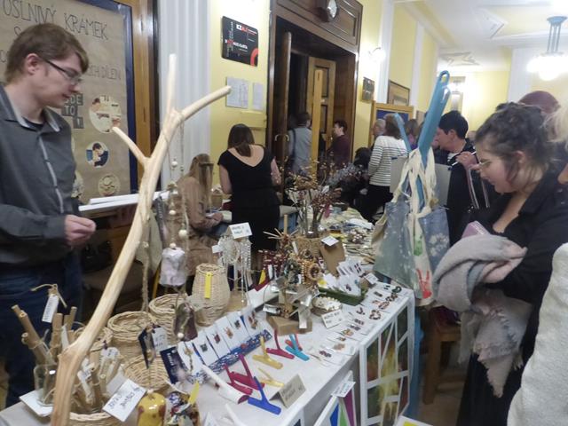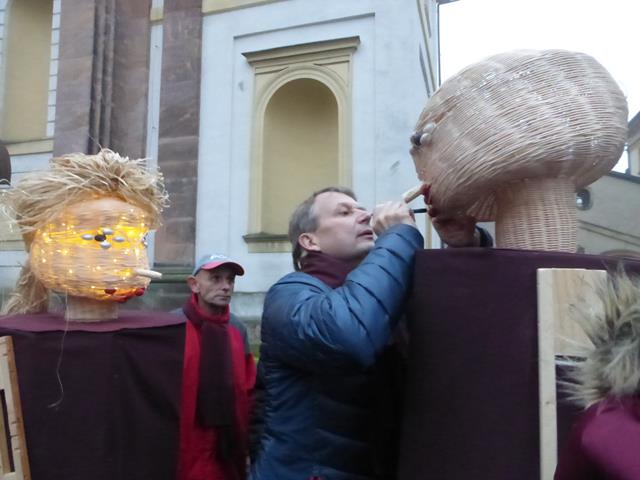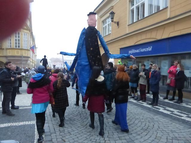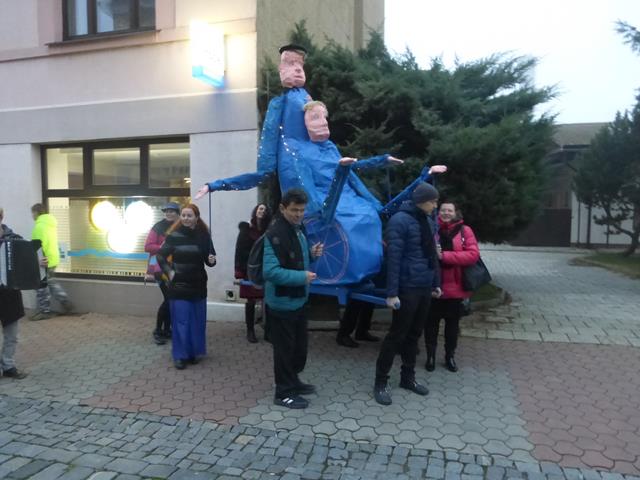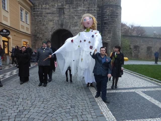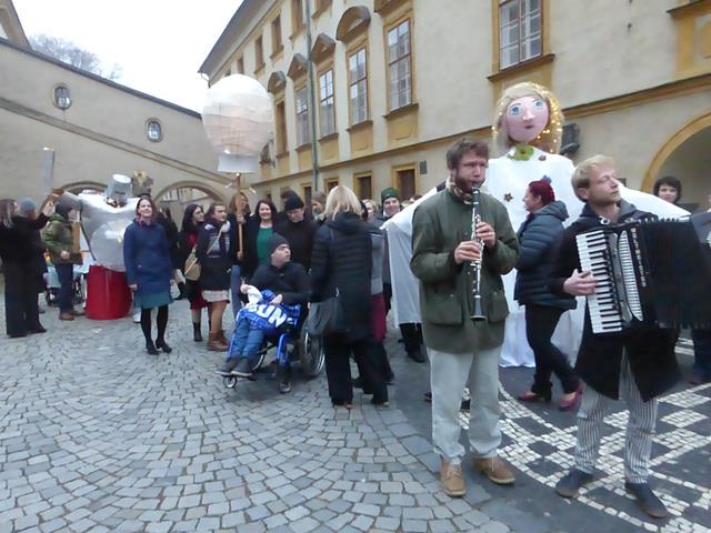 Džentlmen a spíkr, vedoucí průvodu, Kuba na cestě celé to dlouhé hemžení zastavil. Opakovaně jejich jména přečetl a vysvětlil. Defilé bylo i před Masarykovým divadlem. Pak všichni rádi dovnitř do tepla, bál může začít. Ale ještě zastavení hostů u obchůdku. Dýňová marmeláda vyrobená v dílně Apropa, péefky a jmenovky na dárky, šiškový skřítek, náramek z pecek, ovečka z vlny, a další. Chráněné dílny samozřejmě potřebují na materiál. Dárky vkusné, příhodné.